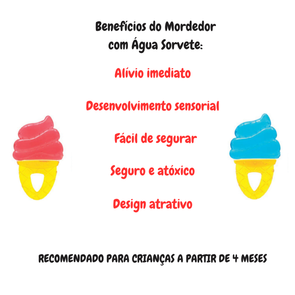 O Mordedor com Água Sorvete foi desenvolvido para proporcionar alívio ao desconforto causado pelo nascimento dos primeiros dentinhos. Com textura macia e um efeito refrescante, ajuda a acalmar a gengiva sensível, proporcionando mais conforto ao bebê. Seu design lúdico e colorido estimula o desenvolvimento sensorial, enquanto o formato anatômico facilita o manuseio, permitindo que o bebê segure e morda com segurança.